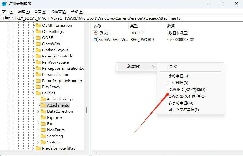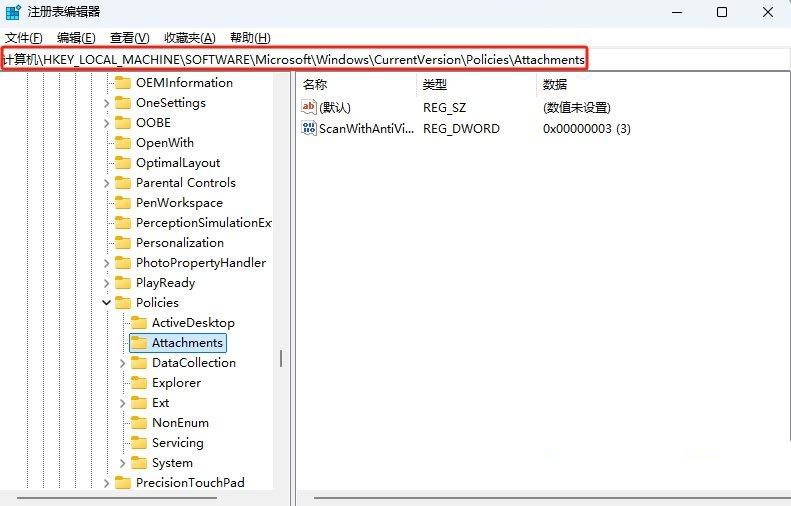 2、接着,依次点击打开“hkey_local_machine\software\microsoft\windows\currentversion\policies\attachments”。