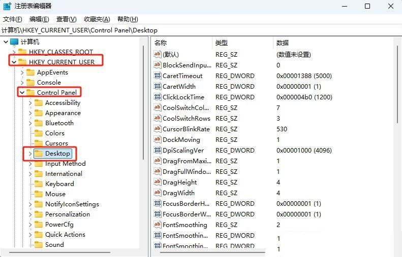 2、接着,依次展开到“hkey_current_user/control panel/desktop”;
