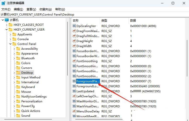 3、然后,在右侧找到“foregroundflashcount” 。(没有的话就手动新建一个dword(32位)值,将其命名为foregroundflashcount即可);