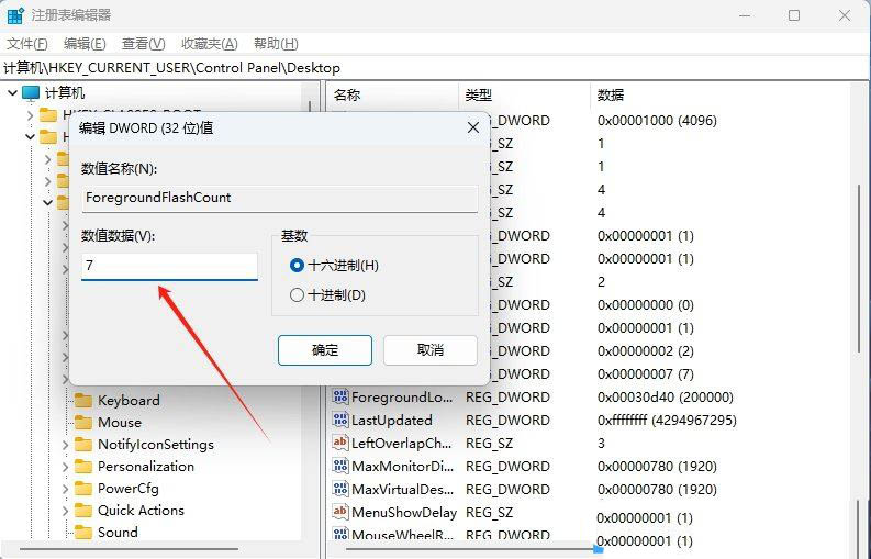 4、随后,双击打开“foregroundflashcount”,将“数值数据”值修改为7,然后点击确定;