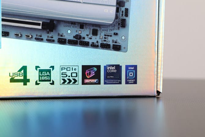 包装上同样使用了炫彩白色的包装,非常硕大的一个主板箱,在不同光线的照射下,会折射出缤纷色彩,颜值非常高,正面是主板的实物渲染图,底部是支持的技术,支持usb 4接口,采用lga1851基座,pcie 5.0技术以及全新的z890芯片组,支持全系列的英特尔酷睿ultra 200s系列处理器。