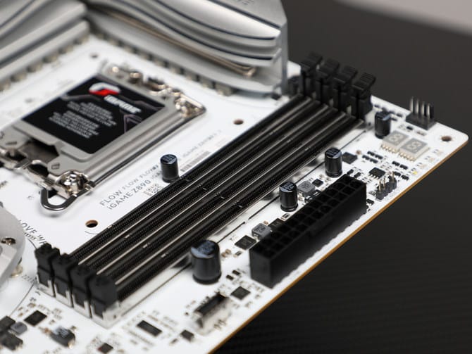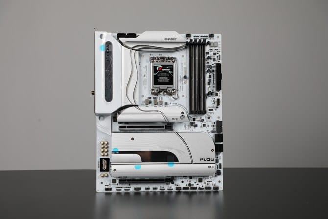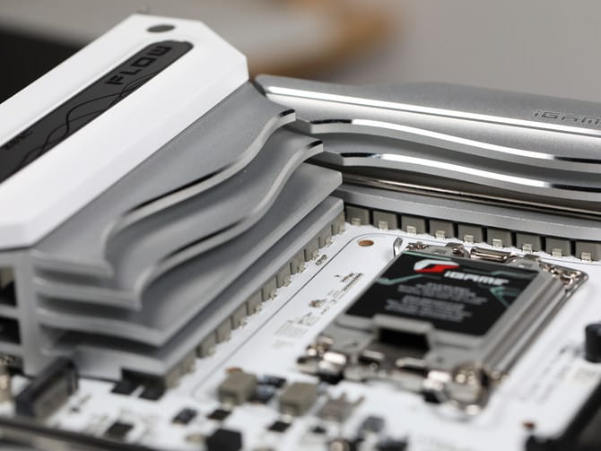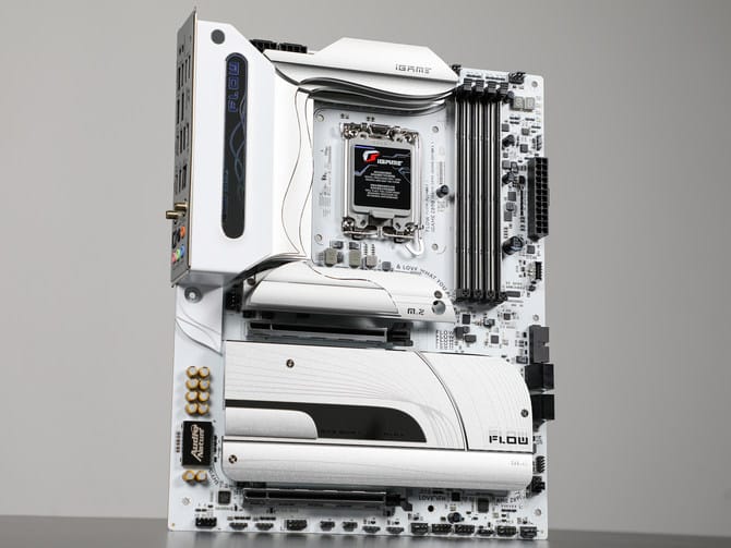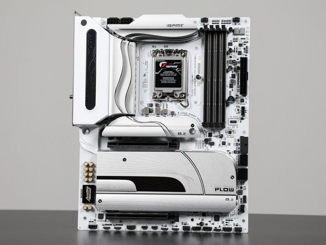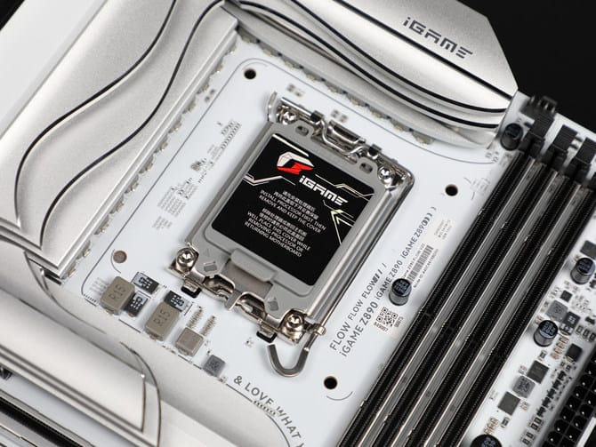 打开包装,七彩虹igame z890 flow主板采用银白色的外观设计,金属质感非常出色,第 一眼的感觉就是视觉冲击力不错,非常犀利,布局也非常合理,是一块非常整的atx大板。