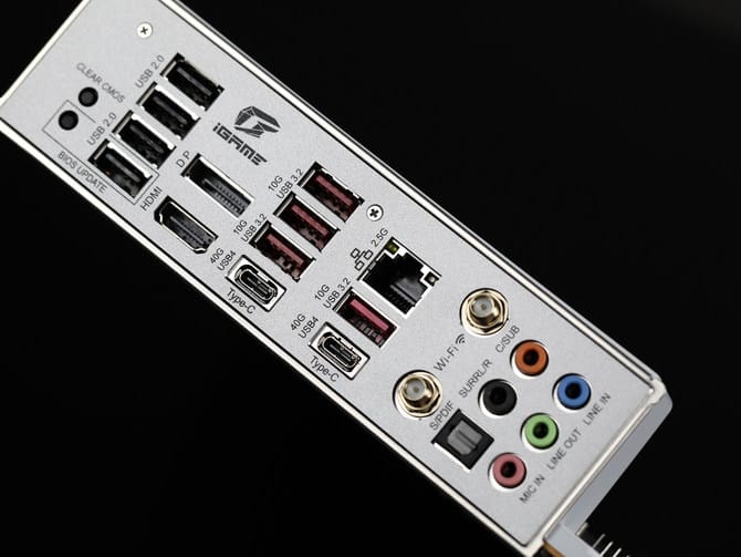 i/o接口方面,igame z890 flow提供了丰富的接口设计,包括2个usb4 40g的usb-c接口,4个usb2接口,dp 1.4,hdmi 2.1接口以及4个10g的usb-a接口,标准2.5g网口,和wifi 7天线,以及7.1声道的音频接口。