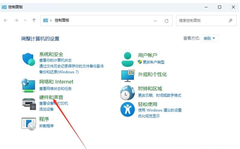 在控制面板窗口中,确保查看方式为“类别”。接着,找到并点击“硬件和声音”选项,这将带您进入硬件和声音的设置页面。