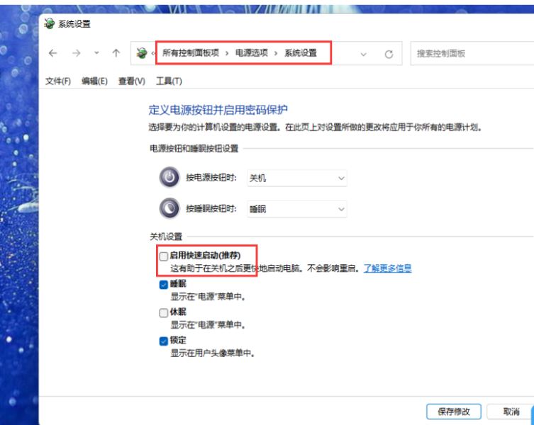 在系统设置窗口中,点击“更改当前不可用的设置”以解锁更多选项。然后,在关机设置部分,找到“启用快速启动(推荐)”选项,并取消其勾选。这一步是确保网络唤醒功能能够正常工作的关键。