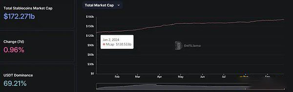 根据 defillama 数据显示,2024 年以来稳定币整体市值已从 1300 亿美元成长至目前 1720 亿美元,年内涨幅高达 32%。