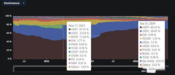 usdc 在 2022 年 3 月时市占率为 32%,之后受到硅谷银行破产倒闭影响,目前市占率仅剩 20.6%,市值也从 550 亿美元跌落到现在 350 亿美元。