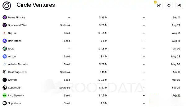 circle ventures 在 2024 年一共投资了 12 笔项目,一个月投资 1~2 个项目,投资项目类型多为支付、rwa 赛道,以及一些零星的基础设施。像是近期融资 3800 万新兴概念 payfi 龙头 huma funance、rwa 信贷市场 centrifuge 等。