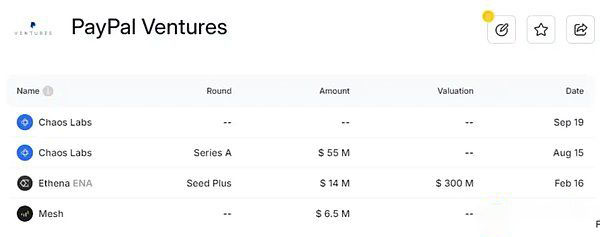 此外也包含今年红极一时的收息稳定币项目 ethena、支付平台 mesh。可以看出 paypal 的发展方向仍围绕着本身稳定币与支付业务。