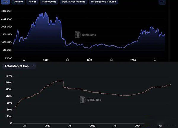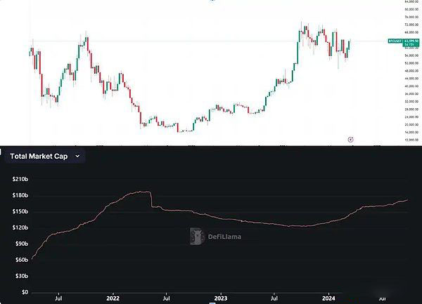2023 年至 2024 年,比特币价格和稳定币市值均呈现逐渐上升的趋势,暗示着市场重新恢复兴趣,资金再次流入加密货币市场。