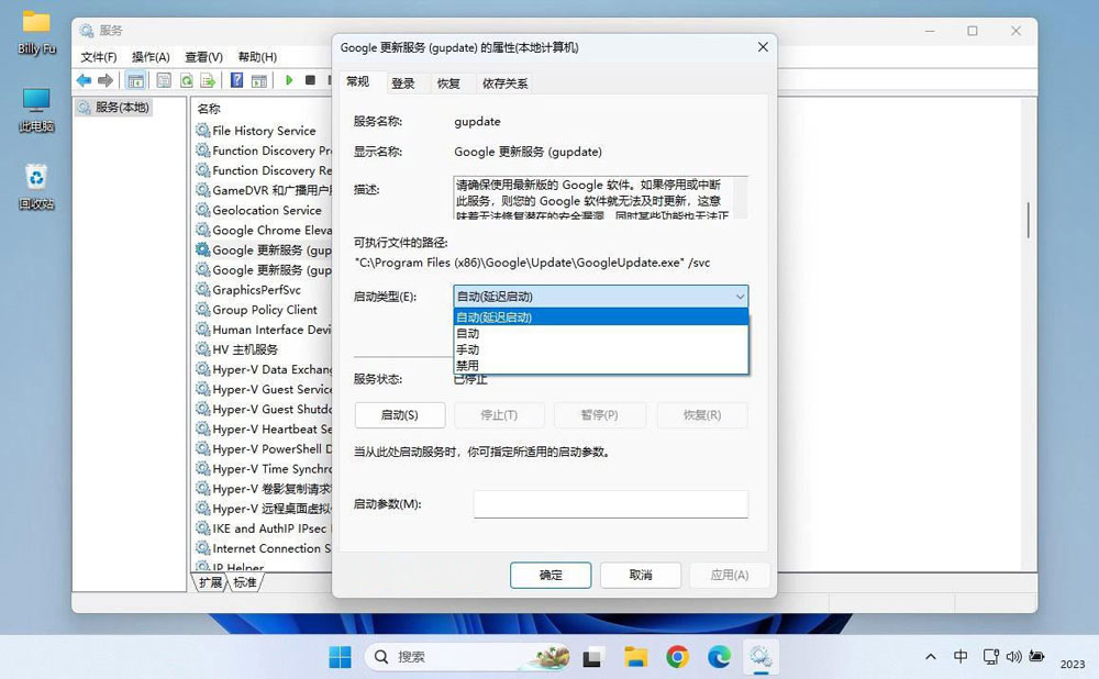 2、在「启动类型」下拉菜单中选择其中一项 – 然后点击「应用」和「确定」关闭窗口。