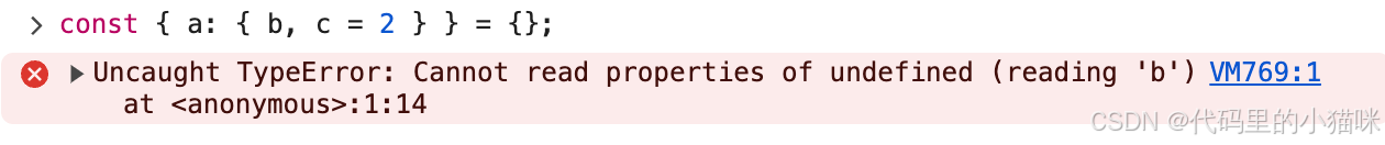 深度解构需要确保每一层的对象结构都存在。否则会引发错误: