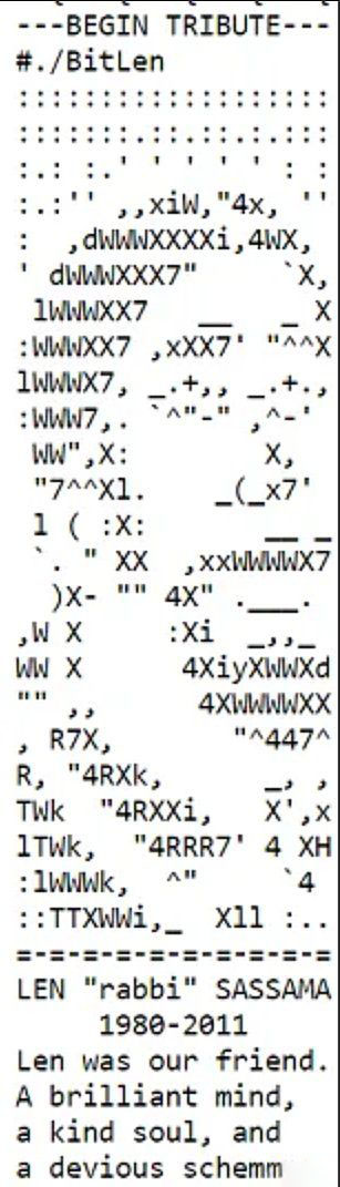 比特币网络的每个节点上都嵌入了一条讣告。它被嵌入到交易数据,用来纪念伦·萨萨曼(len sassaman),他本质上已在区块链中永垂不朽。从很多方面来说,这都是一次恰当的致敬。