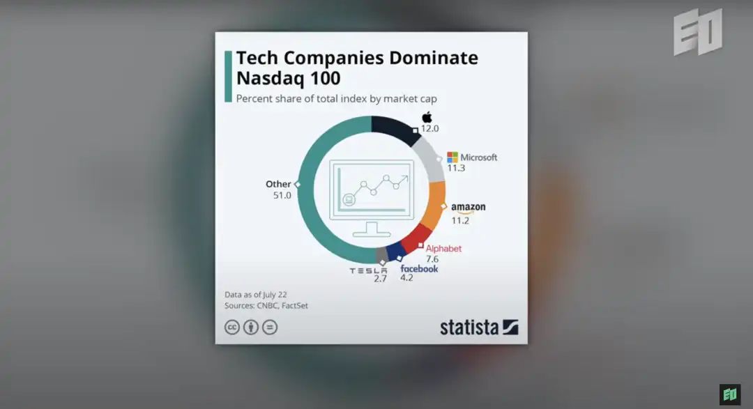 快进到今天,前五大科技公司占据了纳斯达克 100 指数市值的 50%,互联网上的流量和收入有 95% 以上集中在这几家公司手中,所有的趋势表明这种集中化还会继续加剧。
