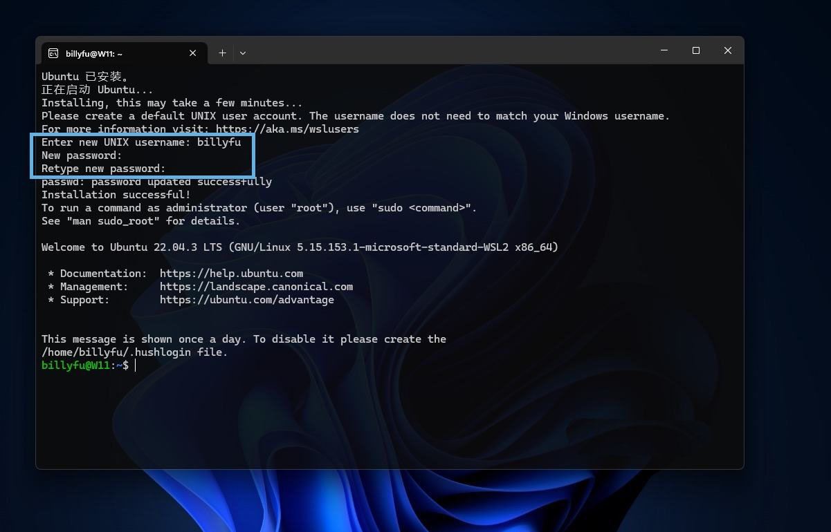4、重新登录 windows 11 后,系统会自动弹出一个命令行窗口,以继续安装并启用 ubuntu。按命令提示设置好你的 linux 用户账户和密码后,即可开始使用。