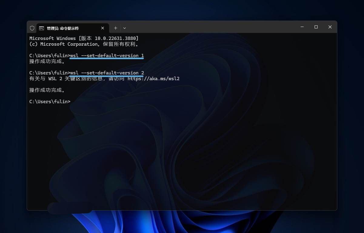 要切换 wsl 默认版本也非常容易,在命令行中执行以下命令即可: