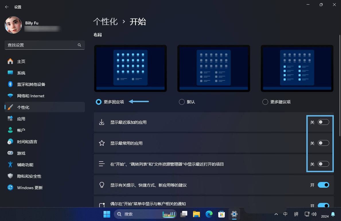 虽然它能帮助你快速访问这些内容,但也占据了过多的「开始」菜单空间,甚至可能无意中暴露个人隐私。如果你不想要这个推荐内容,可以通过以下方法来调整「推荐的项目」区域。
