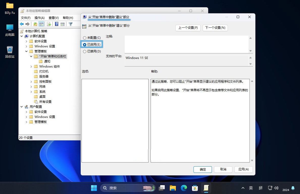 windows 11 se 版本可以通过以下步骤完全移除「推荐的项目」区域;windows 11 专业版或家庭版只能隐藏「推荐」部分中的文件和应用,该部分仍会显示在开始菜单中。