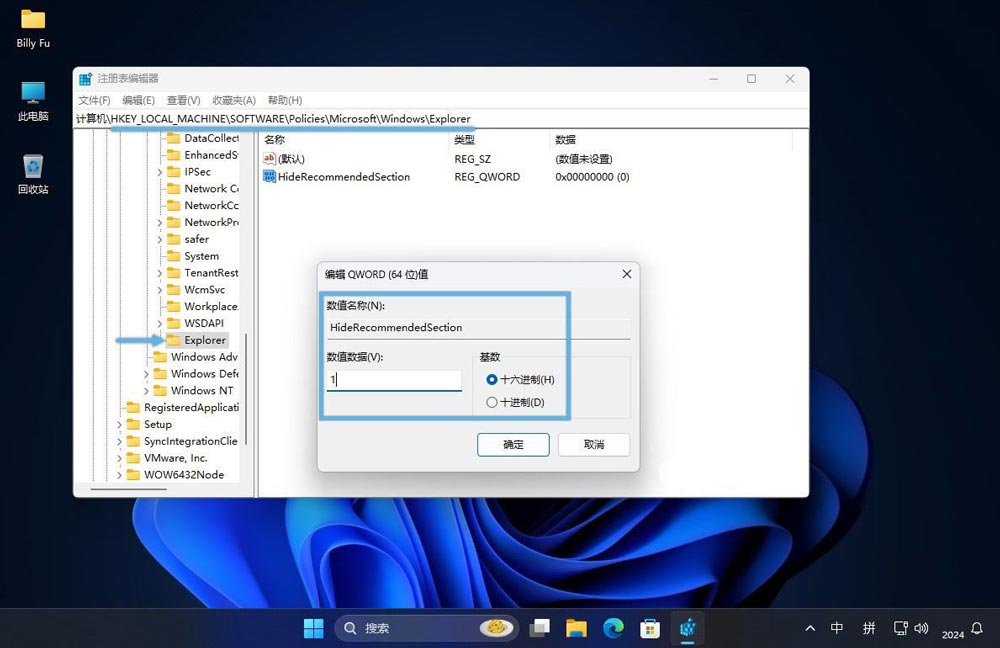 通过注册表 hiderecommendedsection 值控制「推荐的项目」是否显示内容