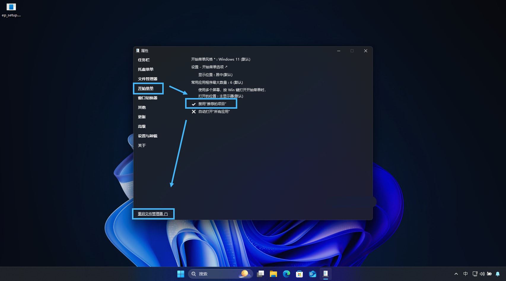 3、在「开始菜单」选项中,将「禁用推荐的项目」打勾,然后点击左下角的「重启文件管理器」。