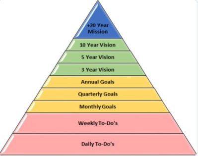 基本上,从一个 20 年以上的使命开始,然后将其细分为 3 到 10 年的愿景。进一步地,要实现 3 年的目标,你需要将其细分为年度目标、季度目标等等。