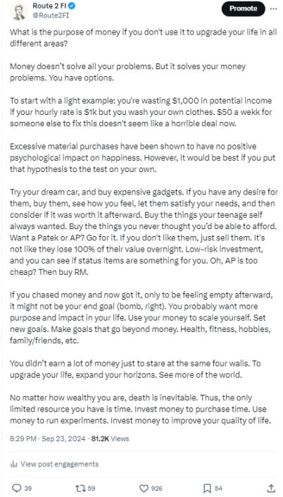 这让我思考,如果你不利用钱来改善自己的生活,那么钱的意义是什么。