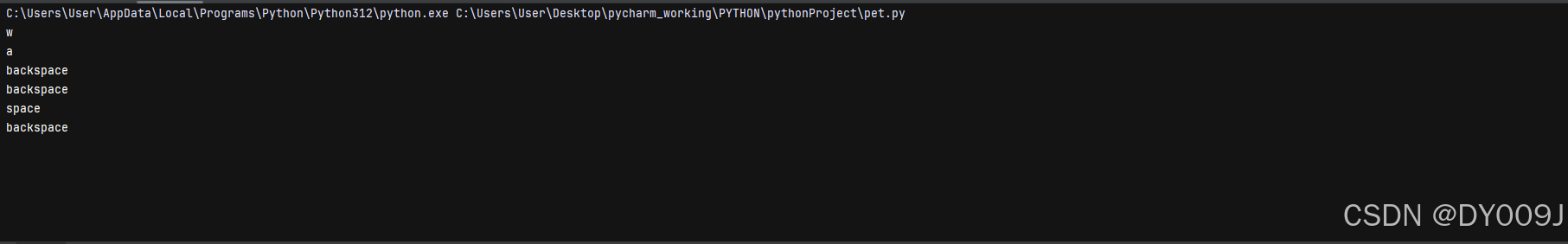 运行以上代码,我们可以在控制台中看到按下按键时输出的按键名称。例如,按下’w’键,控制台会输出w。按下空格键,控制台会输出spacer。
