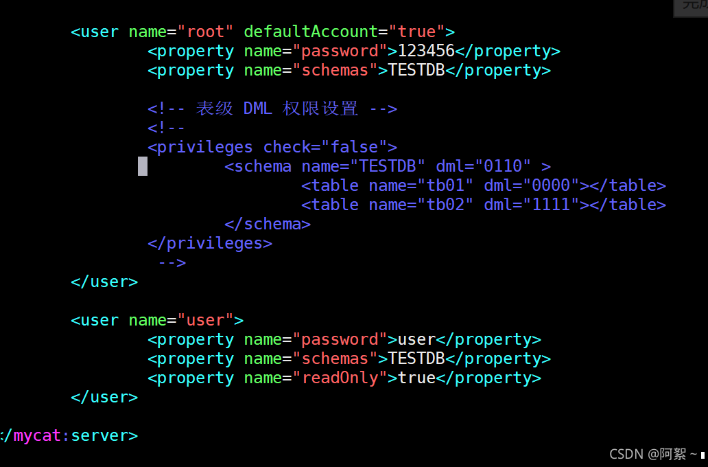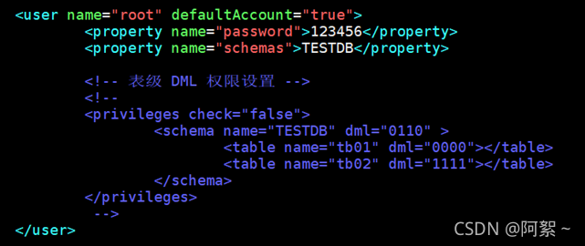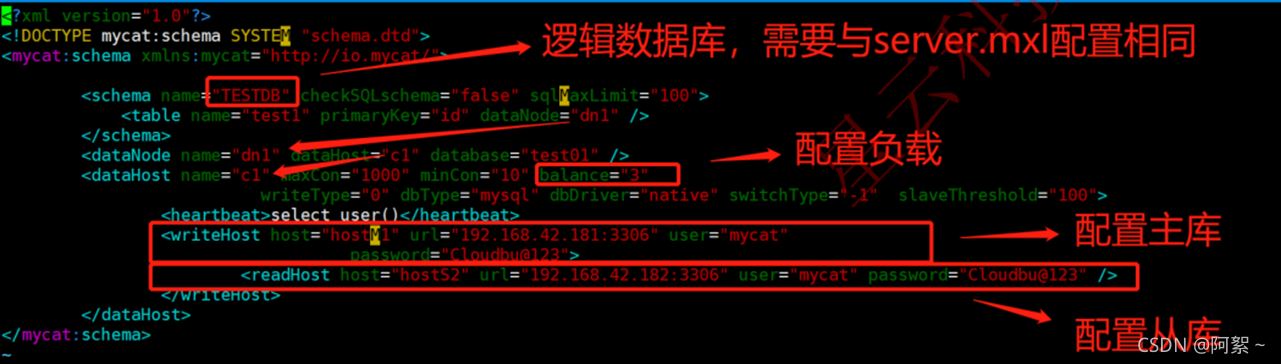 <?xml version="1.0"?> <!doctype mycat:schema system "schema.dtd"> <mycat:schema xmlns:mycat="http://io.mycat/"> <schema name="testdb" checksqlschema="false" sqlmaxlimit="100" datanode="dn1"/> <datanode name="dn1" datahost="auth" database="mytest"/> <datahost name="auth" maxcon="1000" mincon="10" balance="3" writetype="0" dbtype="mysql" dbdriver="native" switchtype="1" slavethreshold="100"> <heartbeat> select user() </heartbeat> <writehost host="hostm" url="192.168.202.145:3306" user="root" password="nebula@123"> <readhost host="hosts1" url="192.168.202.148:3306" user="root" password="nebula@123" /> </writehost> </datahost> </mycat:schema>
