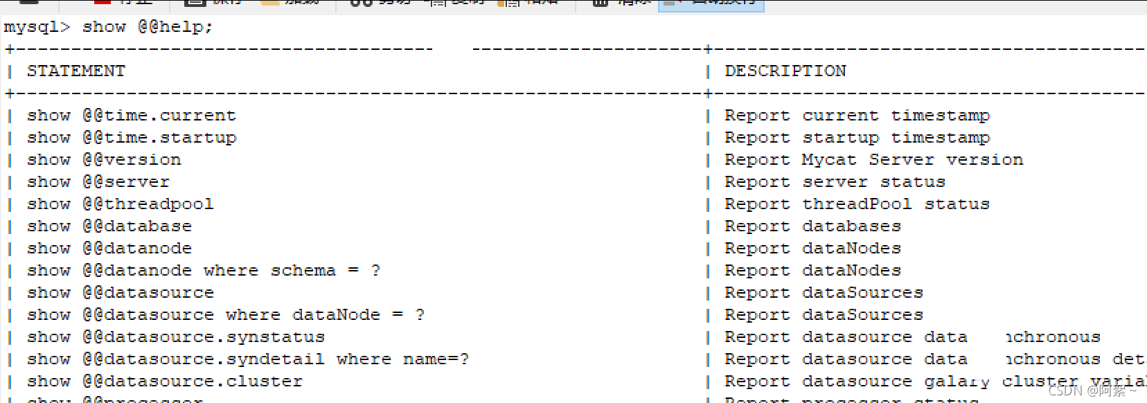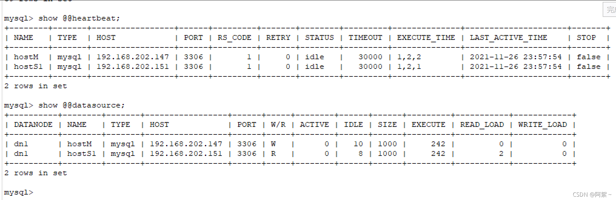 show @@heartbeat;#查看心跳rs_code 1 表示正常show @@datasource; #查看读写配置情况w 写 r 读