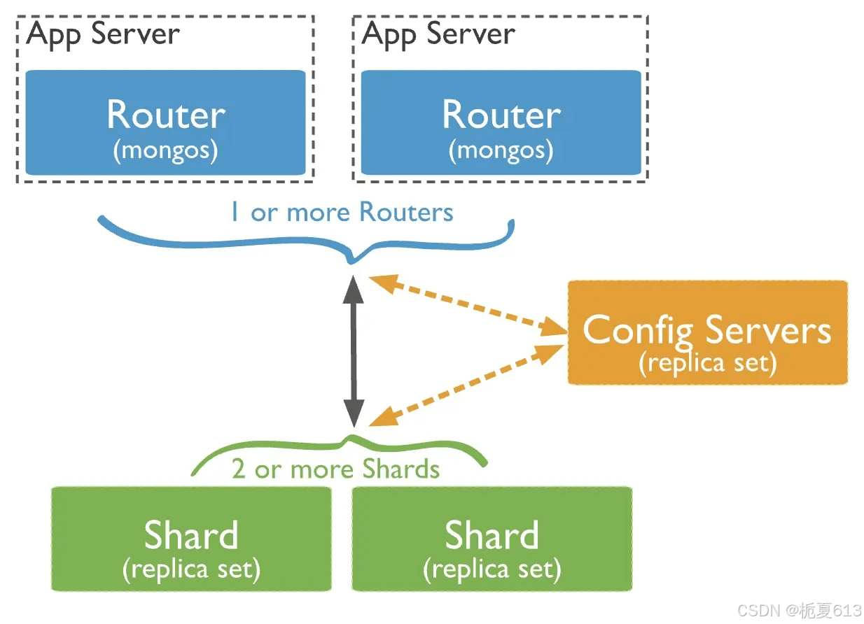 - **mongos:前端路由,**整个集群的入口。客户端应用通过mongos连接到整个集群,mongos让整个集群看上去像单一数据库,客户端应用可以透明使用