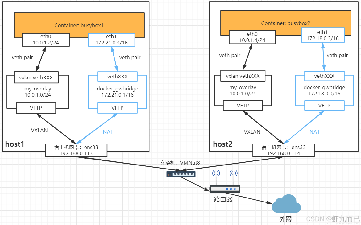 vxlan(virtual extensible local area network)是一种网络虚拟化技术,它使用隧道协议将二层以太网帧封装在三层ip报文中,从而实现跨物理网络的二层连接。这里的vxlan:vethxxx表示通过vxlan隧道连接的虚拟以太网接口,它可能用于将容器的流量封装并通过宿主机发送到外部网络或其他容器。vxlan才是实体,overlay只是网络模型;一句话就是vxlan是overlay网络的一种实现。