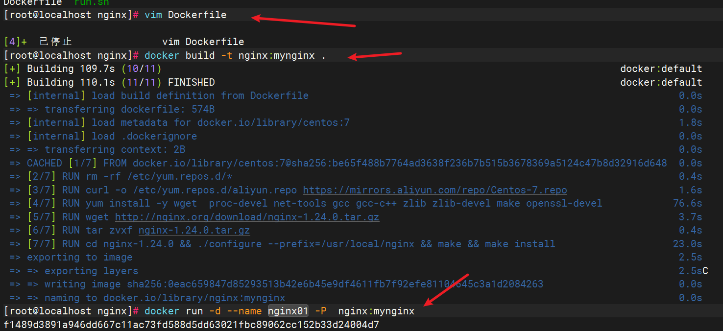 vim dockerfile from centos:7 run rm -rf /etc/yum.repos.d/* run curl -o /etc/yum.repos.d/aliyun.repo https://mirrors.aliyun.com/repo/centos-7.repo run yum install -y wget proc-devel net-tools gcc gcc-c++ zlib zlib-devel make openssl-devel run wget http://nginx.org/download/nginx-1.24.0.tar.gz run tar zvxf nginx-1.24.0.tar.gz run cd nginx-1.24.0 && ./configure --prefix=/usr/local/nginx && make && make install expose 80 expose 443 cmd ["/usr/local/nginx/sbin/nginx","-g","daemon off;"]