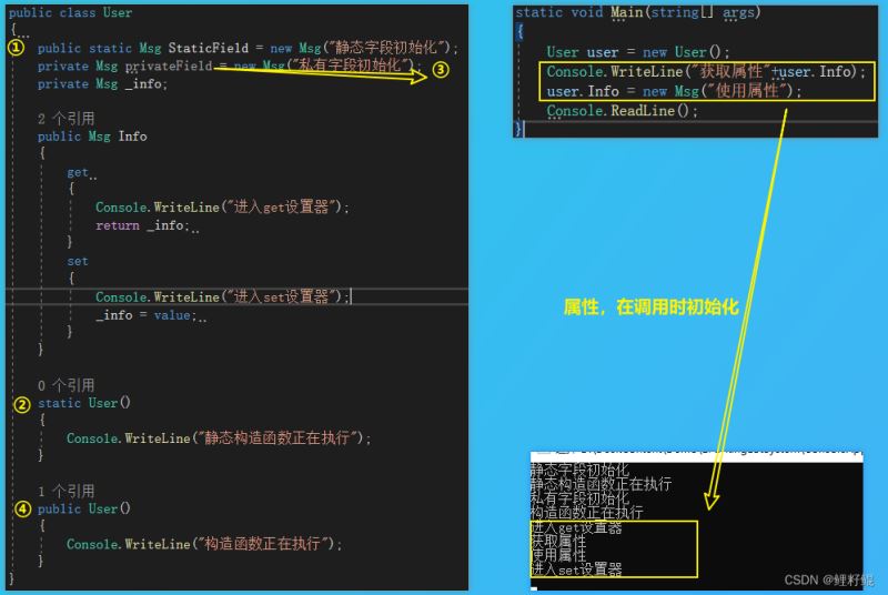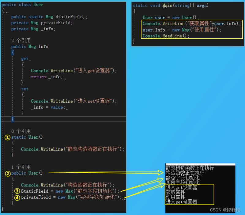 - 在构造函数外初始化的顺序,仍旧是 静态字段=》静态构造函数=》实例字段=》构造函数