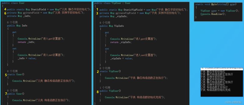 - 再初始化父类的静态成员:静态字段=》静态构造函数