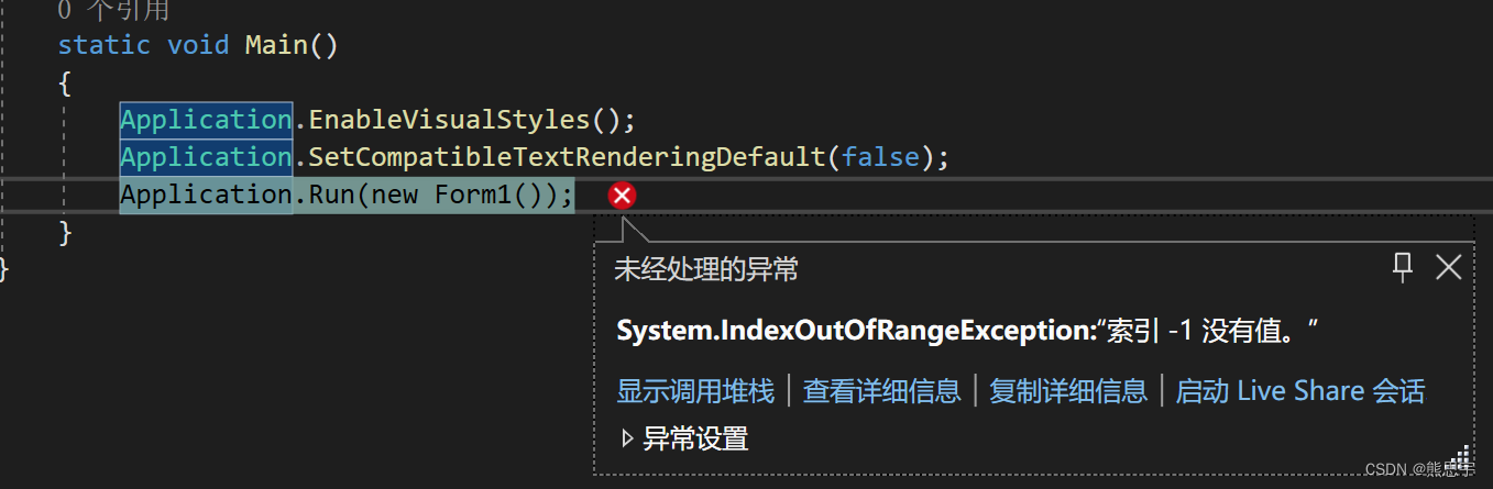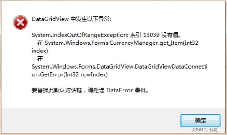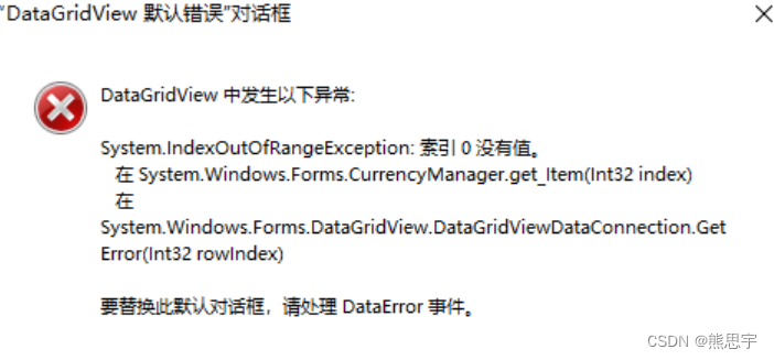 }但是又出现了一个新的错误,由于绑定了一个空的 list,运行时候点击 datagridview1 表单,就会报下面的错误