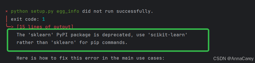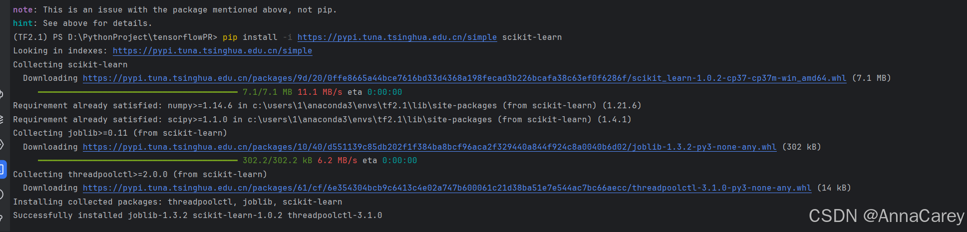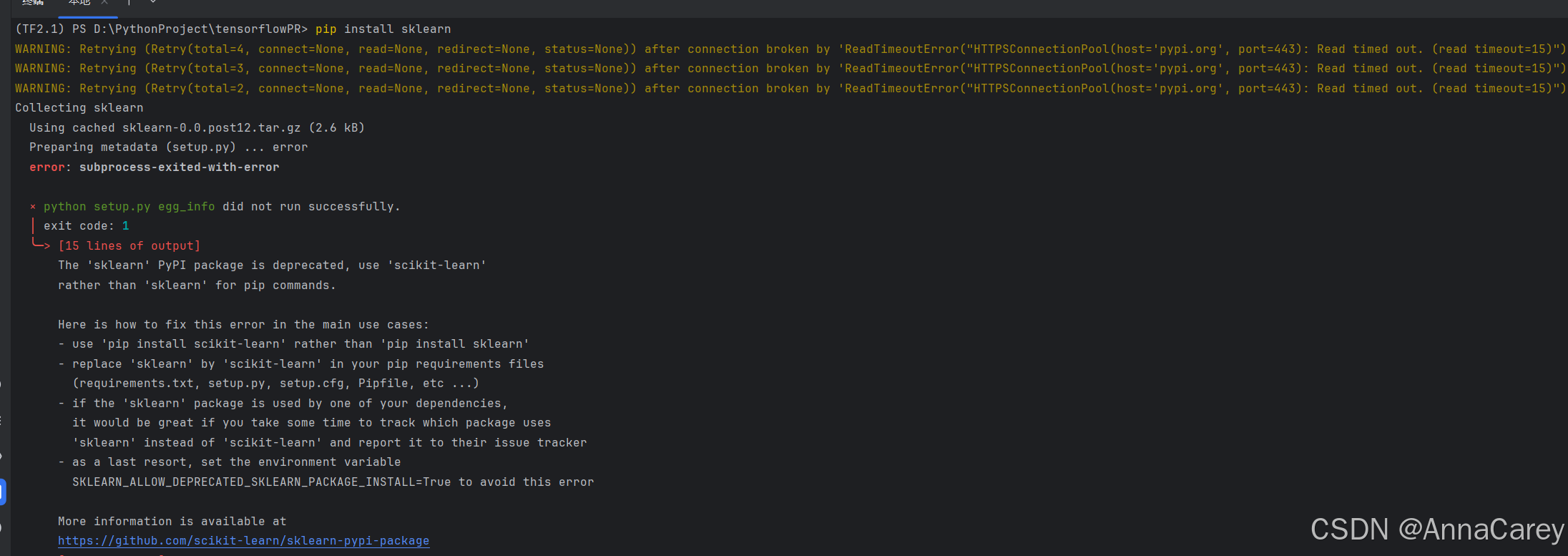 安装sklearn包失败问题在学习tensorflow过程中,安装sklearn包直接使用 pip install sklearn ,安装失败查看原因是sklearn包已弃用,请使用scikit-le