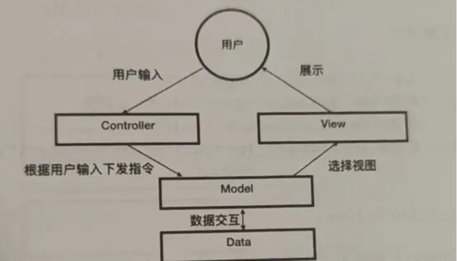 我们通过 m-v-c 的概念来说明前后端分离的概念。m 指的是 model-数据模型,v 指的是 view-视图,c 指的是 controller-控制器。视图可以理解为前端,主要用于对数据的呈现,模型可以理解为后端,主要负责对业务的处理,而控制器主要负责接收用户的输入并协调视图和模型。m、v、c 三者之间的关系如下: