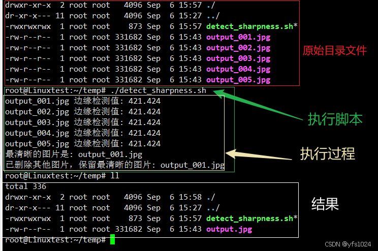 extract_frames.sh提取视频帧输出指定张数据照片并存到指定位置 并执行detect_sharpness.sh脚本(已注释掉, 需要的话自行打开)detect_sharpness.sh从多张照片中选择最清晰的一张 并将其余的照片删除, 且保留最清晰一张并重命名create_directory.sh判断文件夹是否存在, 不存在则创建, 存在则不处理
