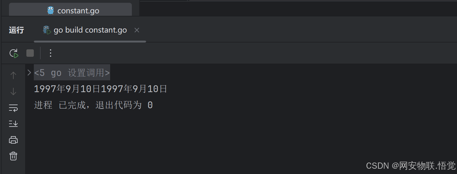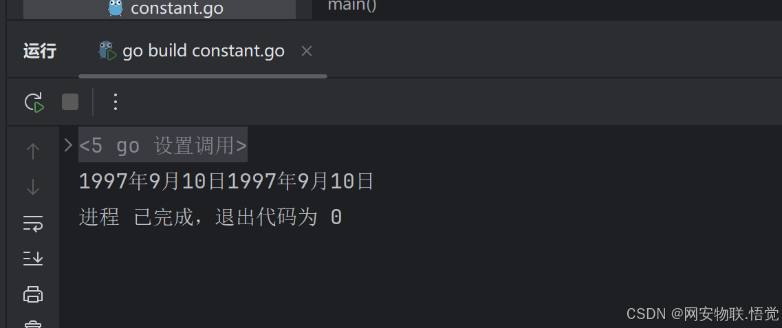 常量定义的形式为 const 常量名 常量类型 = 常量值