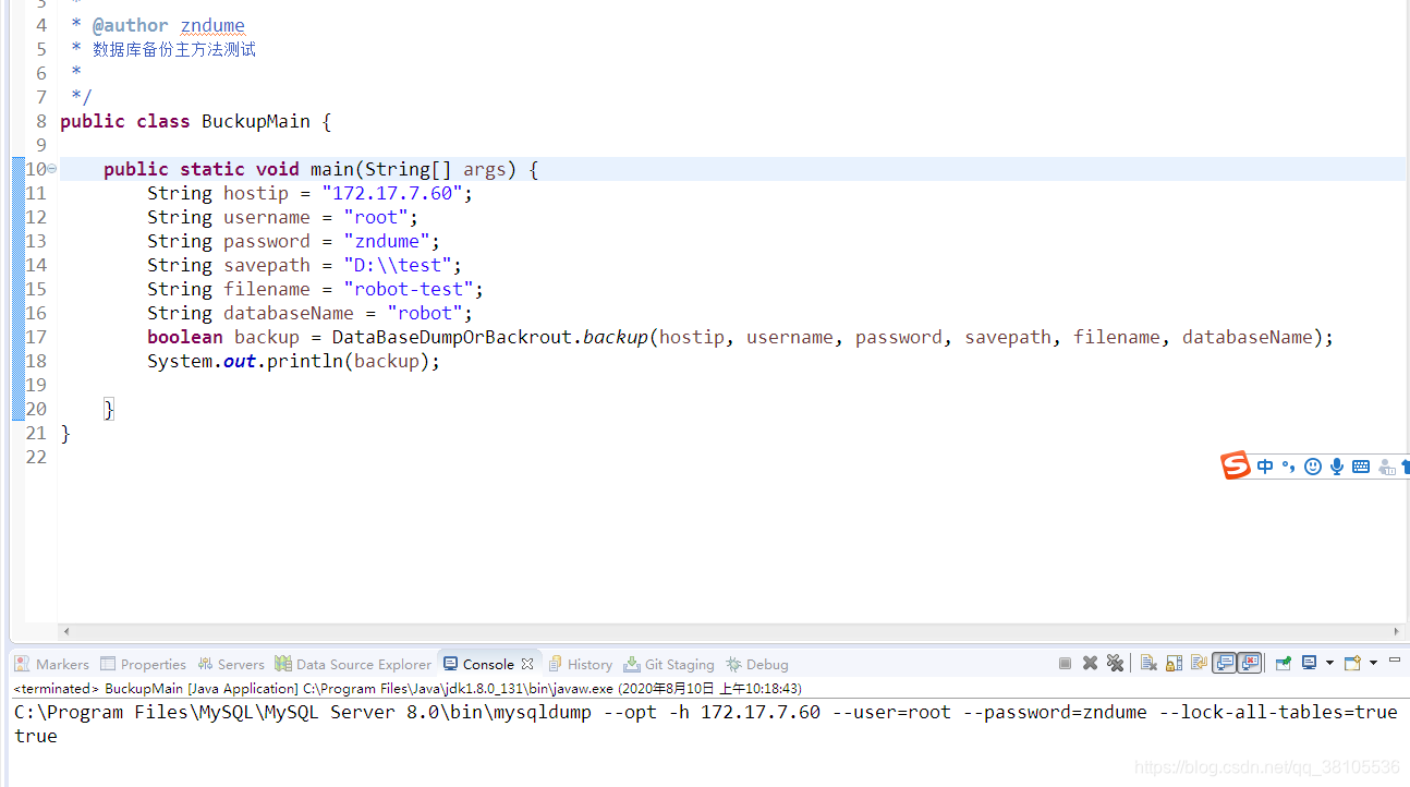 boolean backup = databasedumporbackrout.backup(hostip, username, password, savepath, filename, databasename);