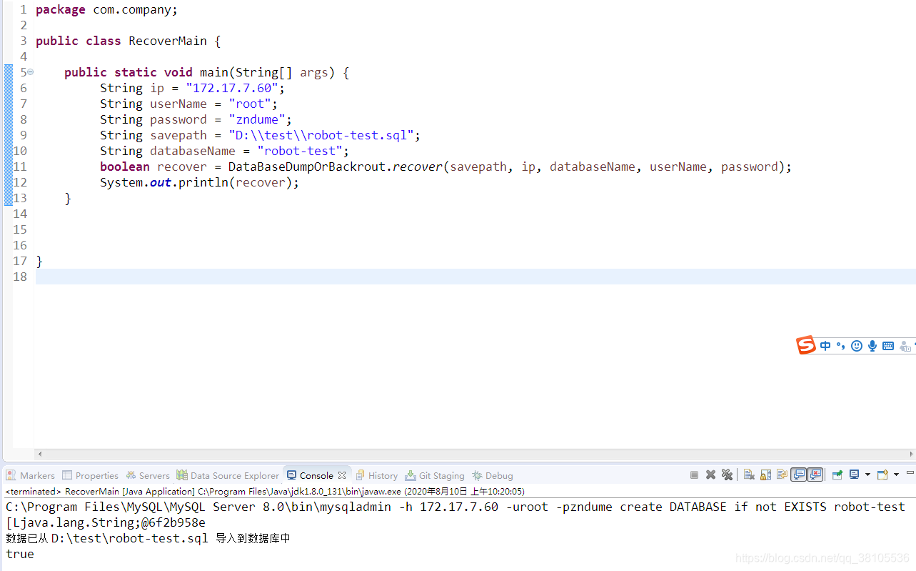 boolean recover = databasedumporbackrout.recover(savepath, ip, databasename, username, password);
