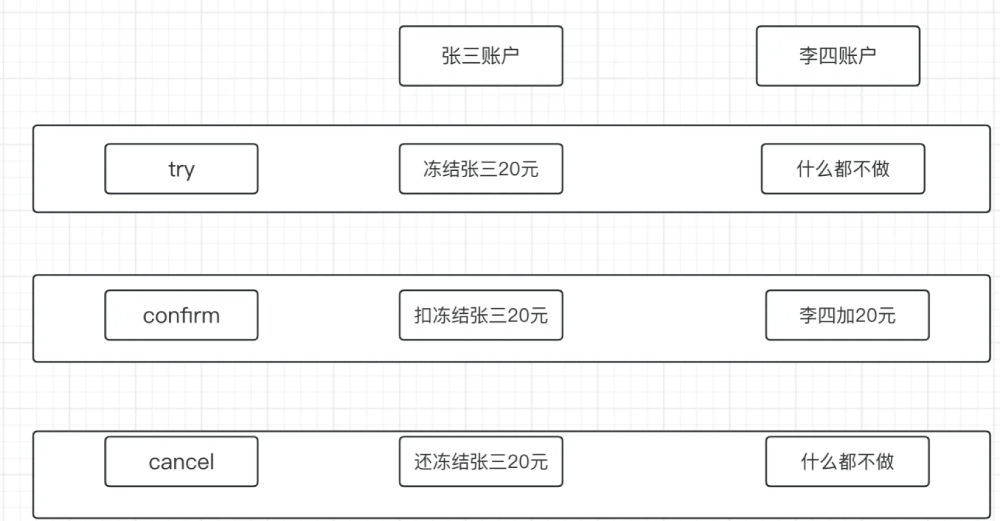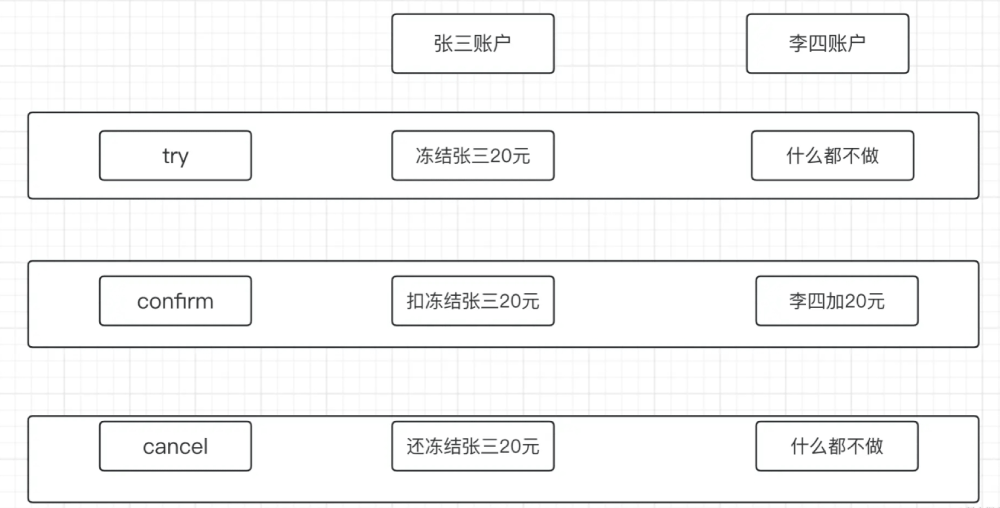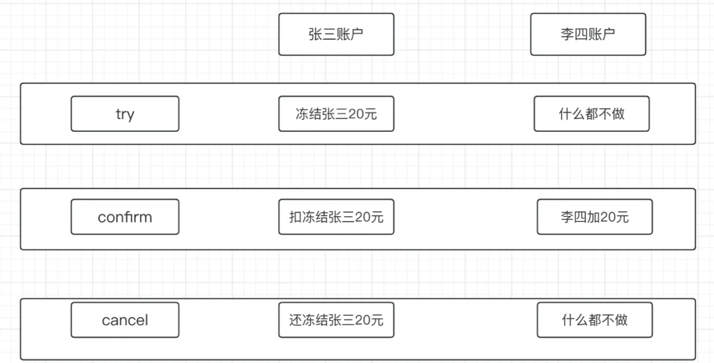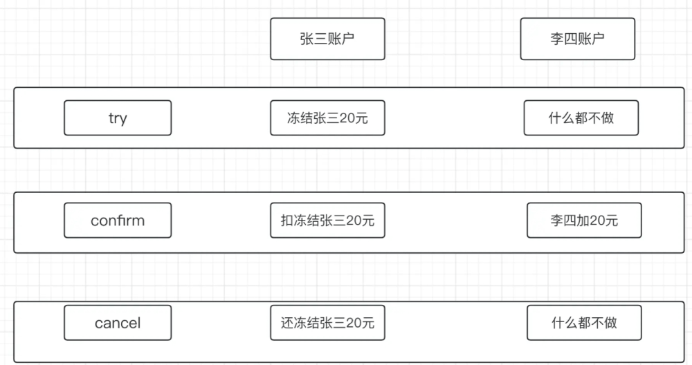 在try阶段我们添加了一个本地事务,如果这时候try阶段异常,那么本地事务就会回滚,所以这时候冻结张三20元的操作就会回滚,也就不会被冻结。那么这时候try阶段异常了,就会执行cancel阶段进行回滚