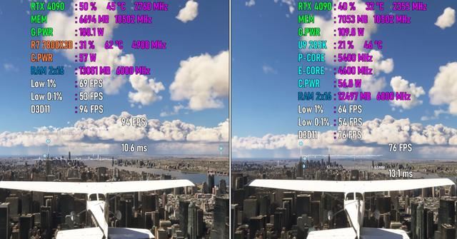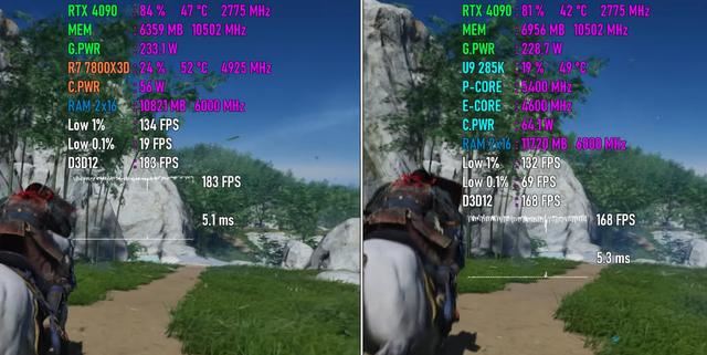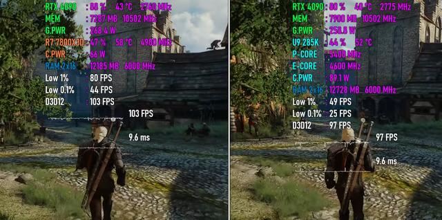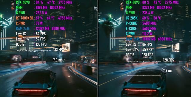 以下将分别测试七款游戏,均采用1080p最高画质模式,以下系列图片中左边代表ryzen 7 7800x3d平台,右边代表core ultra 9 285k平台。