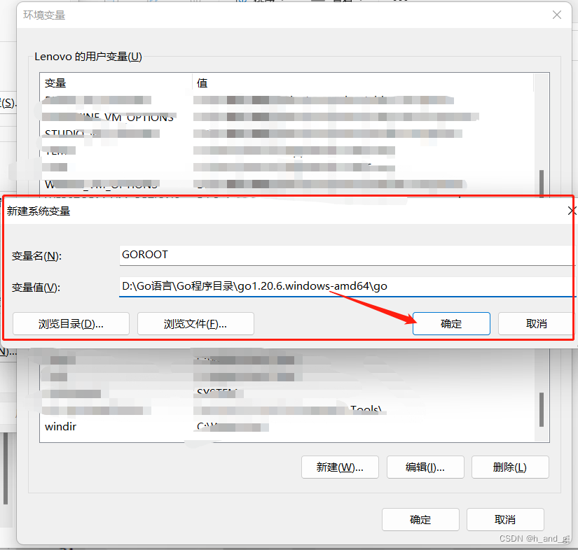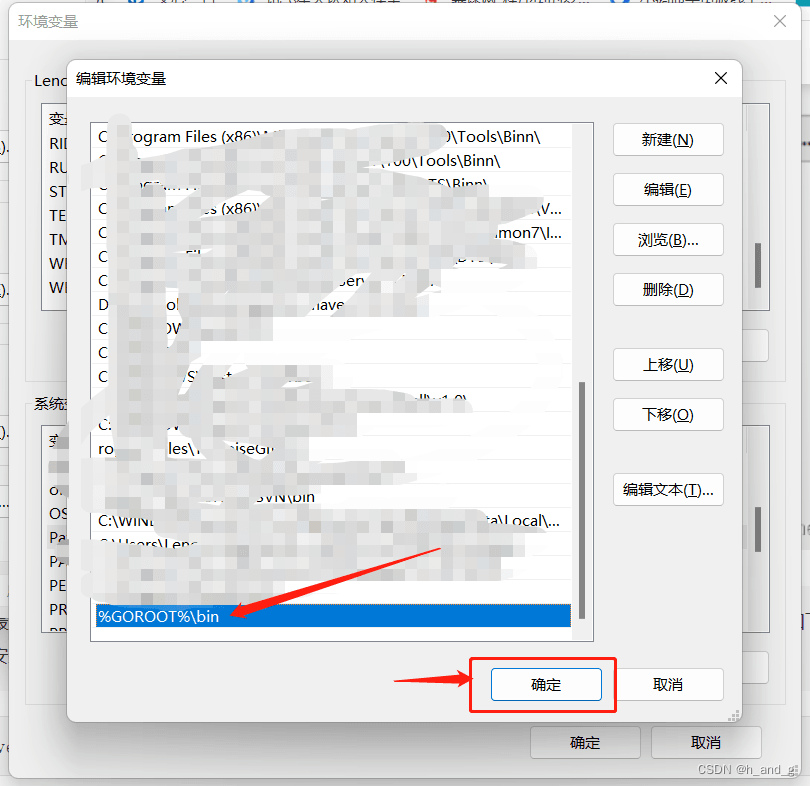 然后将新建的goroot配置到 path 这个环境变量中去,在系统变量中找到 path,点击编辑->新建,输入%goroot%\bin,点击确定。并将所有母窗口的确定全部点下,确保环境变量生效。