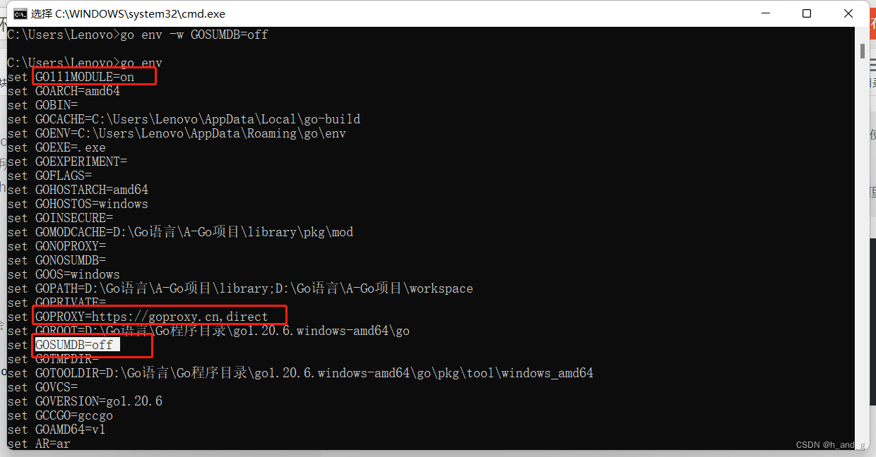 #开启mod模式(项目管理需要用到) go env -w go111module=on #重新设置成七牛镜像源(推荐)或阿里镜像源(用原有的会比较慢) go env -w goproxy=https://goproxy.cn,direct go env -w goproxy=https://mirrors.aliyun.com/goproxy #关闭包的md5校验 go env -w gosumdb=off #查看环境变量 go env