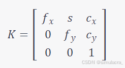 内参矩阵是描述相机内在参数的3x3矩阵,包含了相机的焦距和光学中心的位置。这些参数定义了相机的成像过程中的投影关系,内参矩阵一般表示为: