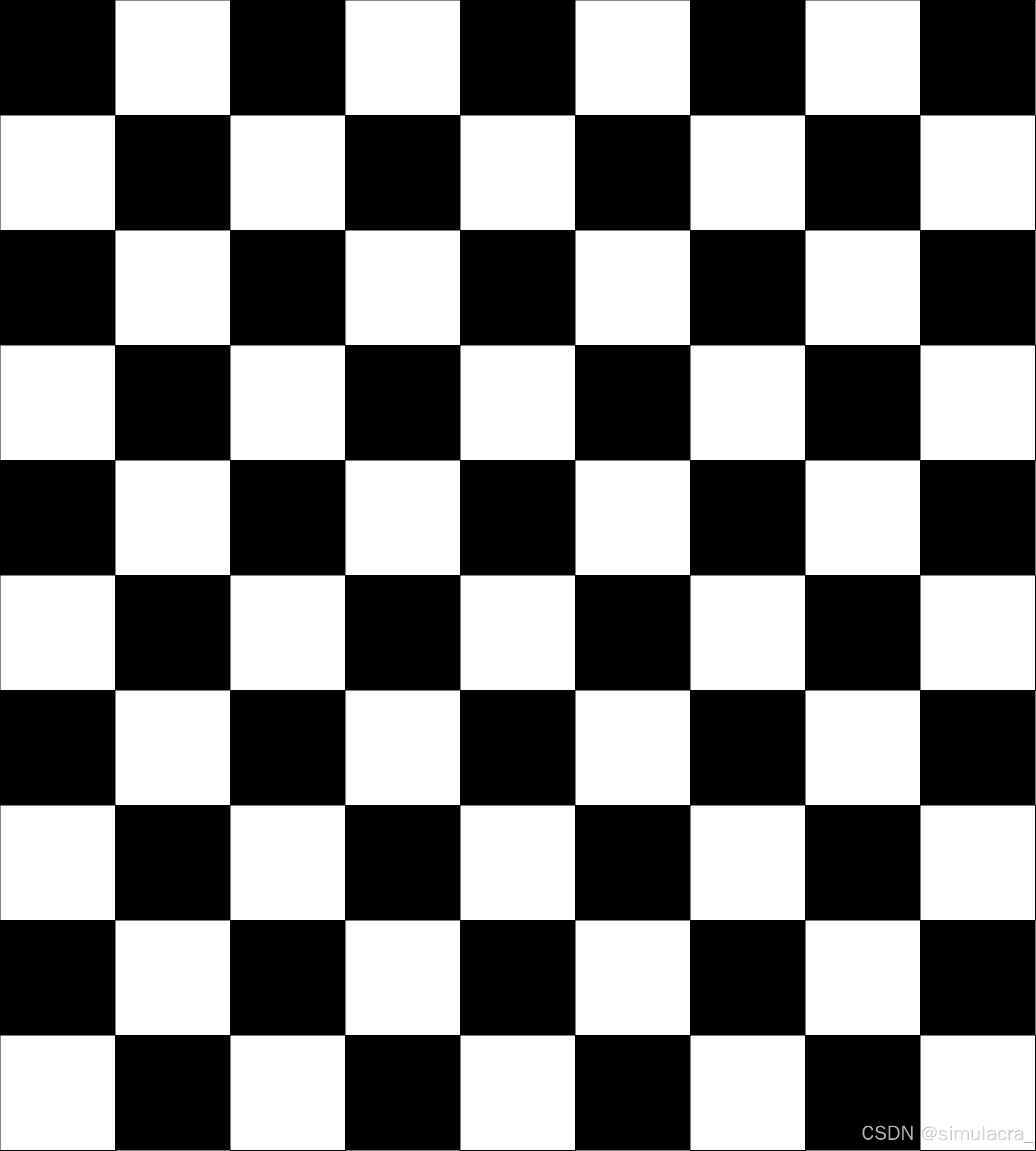 - 标定采用的黑白棋盘格单元格长度最好为2cm,且棋盘格格数最好为奇数*偶数,我采用的标定板为如图所示的a4纸打印的9*10的黑白棋盘格,标定棋盘格如果太大(如a3)会导致无法保证棋盘格在视野的各个位置(上下左右中)都出现在视野范围内。