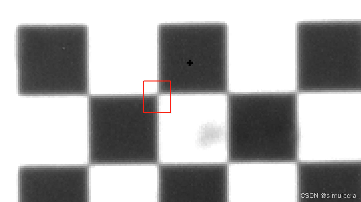 - 拍摄时固定相机位置旋转标定板,光线对标定效果影响很大,如果标定效果不理想可以多打光,可以使角点更容易识别,角点的梯度边缘占的像素3-4还可以,1-2算不错,双目相机如果没有自带的拍照软件可以拍照后在电脑的画图中将图片放大800%以上,也可以看到角点的像素。下图为示例,其中一个块就是一个像素点。