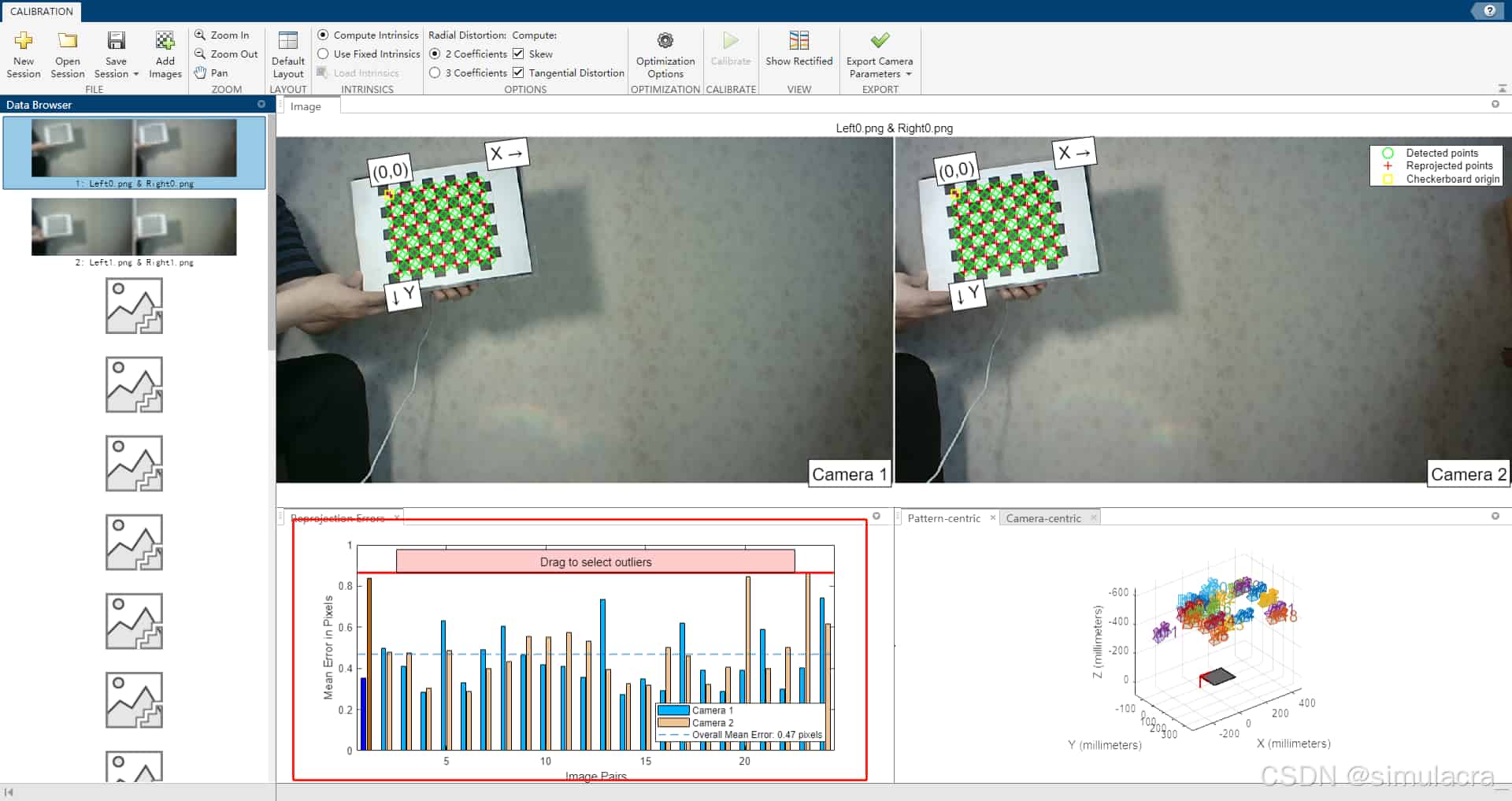 - 得到标定图片后,打开matlab 上方的工具栏app,找到图像处理和计算机视觉下的stereo camera calibration工具,打开并将左右相机的图片导入,一般要求平均像素误差在0.1左右