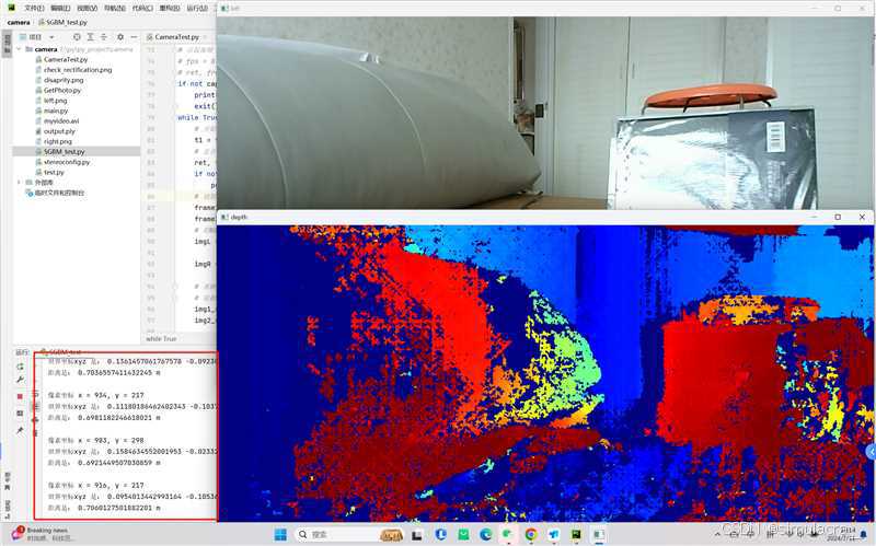 dis_color = cv2.applycolormap(dis_color, 2)计算三维坐标数据,将其乘以16以获得实际距离。显示深度图和左图像,并设置鼠标回调函数,当按下 q 键时退出循环: